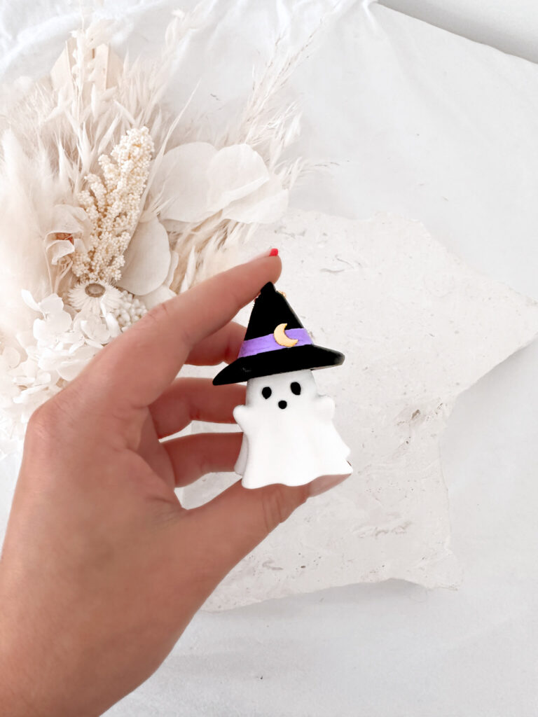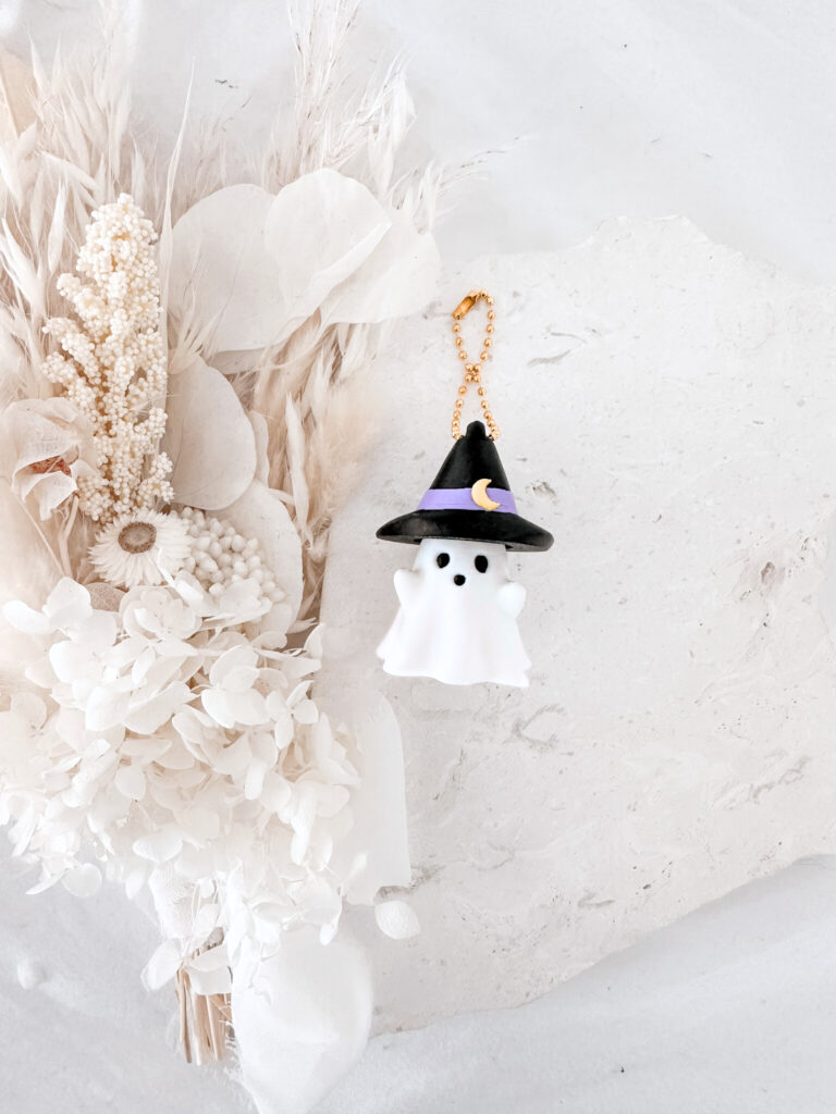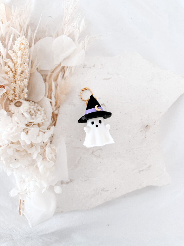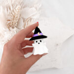 Featuring a cute white ghost wearing a black witch hat with a purple band and golden crescent moon, this pocket-sized companion is both fun and functional.