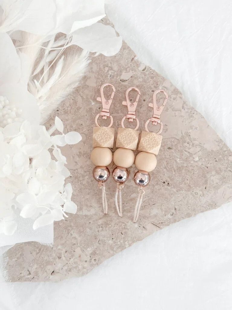 Keychain Clasps & Beads may tarnish over time/extensive use. Keep in a cool/dry environment to help prevent this.