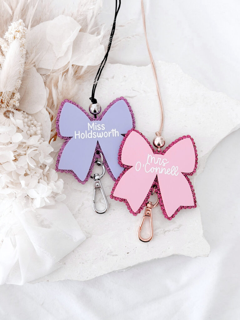 Each piece is custom-made with your name, paired with a sweet bow design for that extra girly touch.