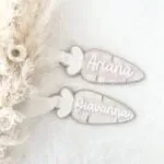 Each tag comes with the name in a raised white acrylic and a solid birch wood base