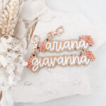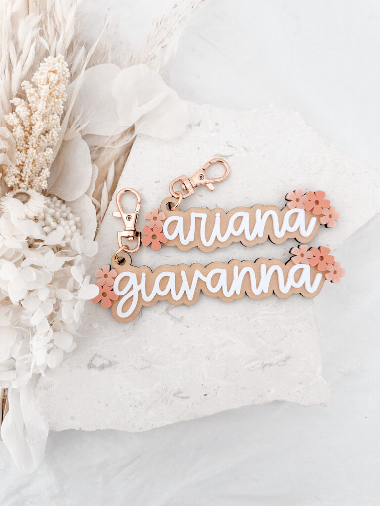 Featuring soft neutral tones, elegant script lettering, and dainty flower details, these keychains are perfect for kids, teens, and adults alike.