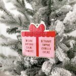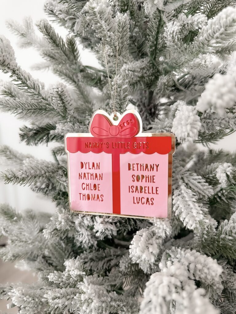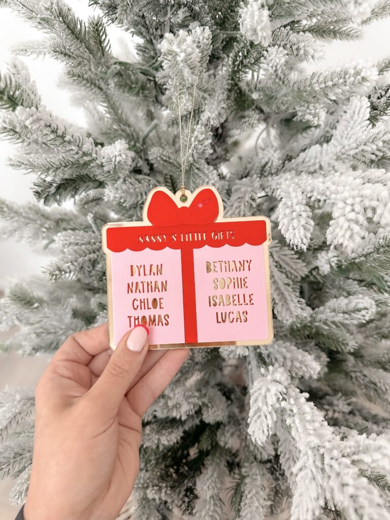 Our Little Gifts Ornament features a large present design (colours are customisable), with all the names cut out.