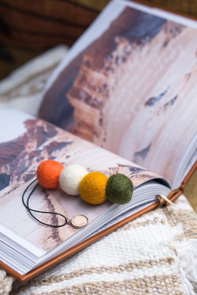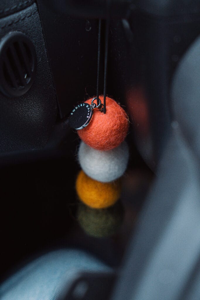 4 Unscented Felt Balls with branded charm and elastic string for easy hanging.